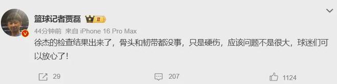 至于在此役次节被撞到膝盖,仅打约14分钟便伤退的徐杰,经过检查骨头和韧带都没事,所以没啥大碍,既然只是硬伤休养一段时间即可。