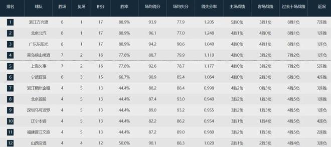 目前为止,卫冕冠军广厦队8胜1负高居联盟榜首,北京队同样8胜1负紧随其后,广东队也是8胜1负位列第三,青岛队7胜2负第四,上海队7胜2负第五......