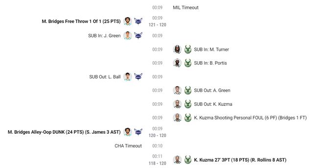 库兹马命中这个120-108的三分球后雄鹿全队开始庆祝,球迷们都站起来庆祝。可很快就笑不出来,因为布里奇斯面对库兹马完成了空接2+1,黄蜂121-120再度反超黄蜂。