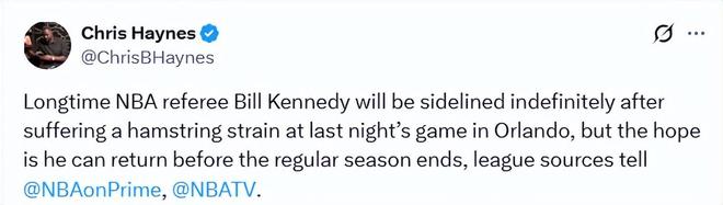 赛后,联盟官方宣布,肯尼迪因右腿伤势确定退出本场剩余执裁工作。