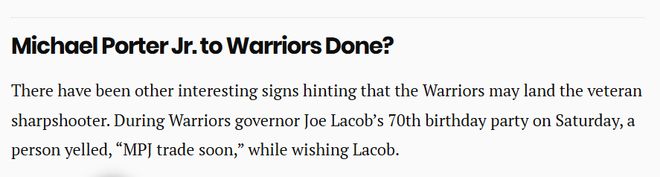 还有其他有趣的迹象暗示,勇士可能已经接近得到小波特。在勇士老板乔-拉科布的70岁生日派对上,有人在向拉科布送上祝福时大喊:“很快就会有小波特的交易了。”