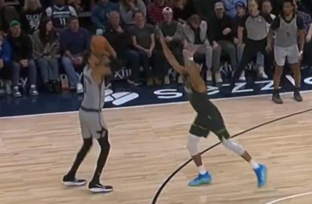 比赛进行到末节还剩7分25秒时,文班面对法国老乡戈贝尔出手三分,戈贝尔垫脚文班,被吹罚一级恶意犯规+技术犯规。