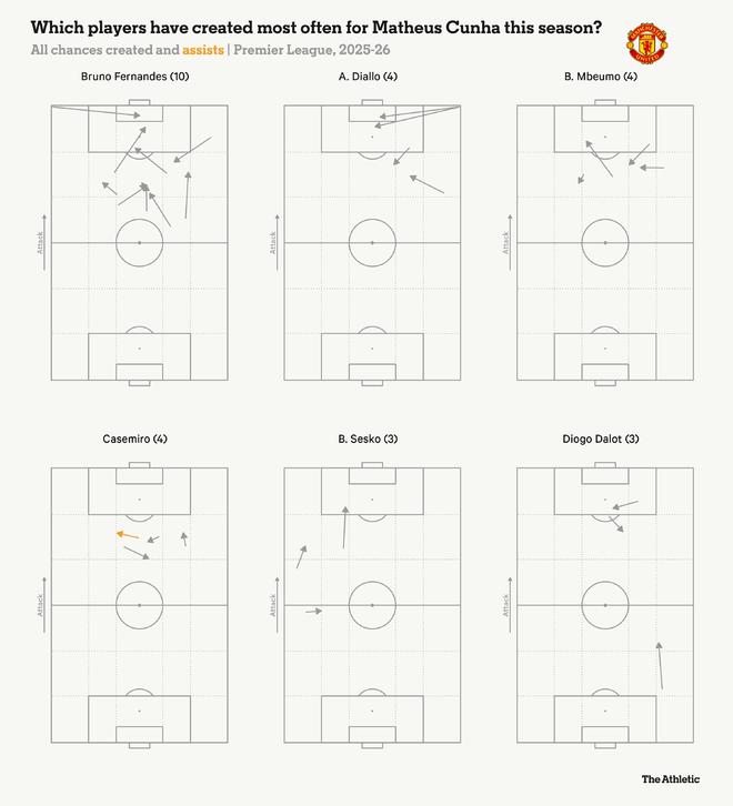 值得肯定的是,阿莫林和库尼亚在多场比赛中找到了新的方式,即便没有类似狼队时期拉森那样的中锋。在安菲尔德2-1的胜利证明了球队在无中锋体系下的可行性,库尼亚更多通过争抢长传后的第二落点,并在转换阶段参与进攻。曼联在比赛中偶尔会在对方禁区前出现一小段进攻空当,但库尼亚正在尝试绕开这一空间,而不是被限制其中。需要注意的是,本赛季多古和达洛特从库尼亚脚下接球时所处的位置靠前。曼联2025-26赛季的走势,在很大程度上将取决于翼卫在进攻三区的表现。