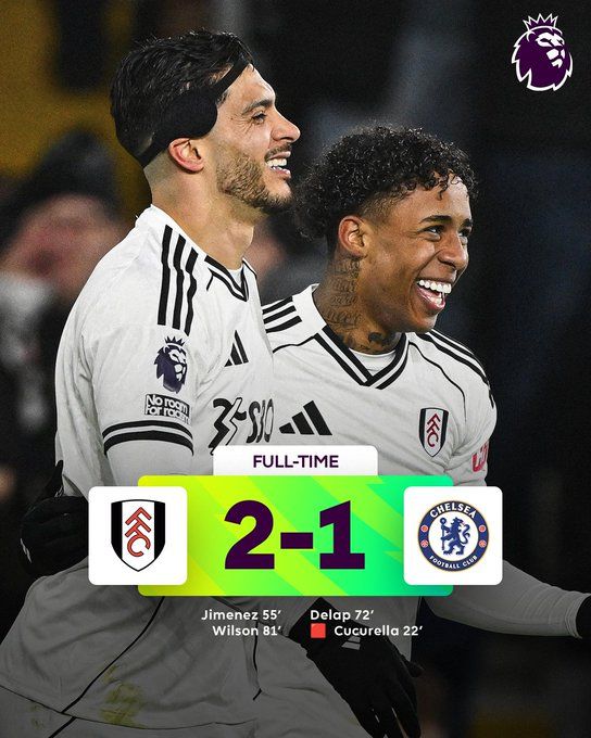 北京时间1月8日03:30,英超联赛第21轮,富勒姆坐镇主场克拉文农场球场迎战切尔西。上半场,库库雷利亚直红被罚下,威尔逊破门被吹。易边再战,希门尼斯打偏僵局,德拉普处子球扳平,威尔逊进球富勒姆再次领先。最终富勒姆2-1十人切尔西。积分榜方面,切尔西31分第七,富勒姆31分第八。
