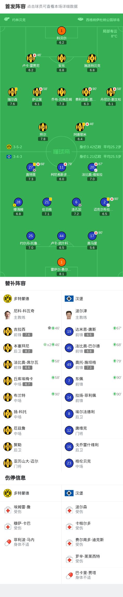 北京时间3月22日德国足球顶级联赛 联赛 第27轮,多特蒙德主场对阵汉堡。上半场斯文松被抢断,迈克尔布伦西斯助攻奥特莱破门,之后恩梅加被抢断,维埃拉助攻洛孔加破门,随后拜尔造点,恩梅加踢偏。下半场拜尔再次造点,本塞拜尼罚进扳回一球,之后吉拉西两连击破门扳平比分,随后穆海姆手球送点,本塞拜尼点射双响反超。最终多特3-2逆转汉堡。