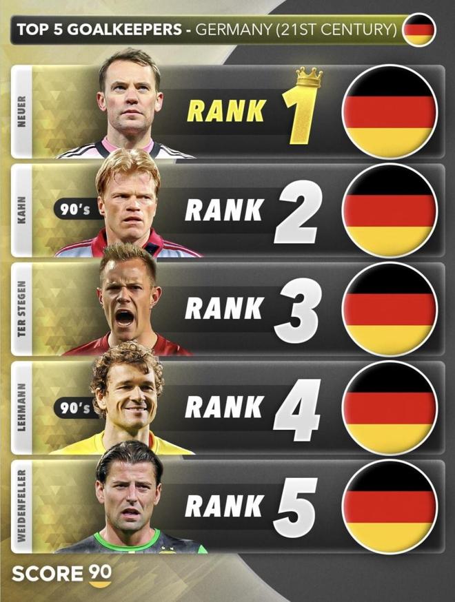 最近Score90发布了德国21世纪门将前五排名。诺伊尔坐上第一的位置,后面的卡恩、特尔施特根、莱曼和魏登费勒也都在列。第一名看起来悬念不大,真正容易让人多看两眼的,还是后面几个人的先后顺序。尤其是第二到第四这几个位置,这样排,真的都能服气吗?